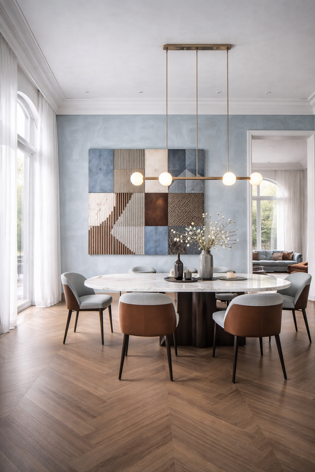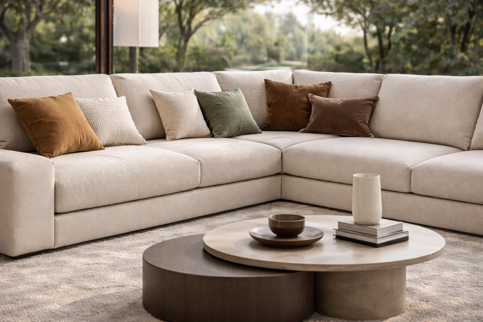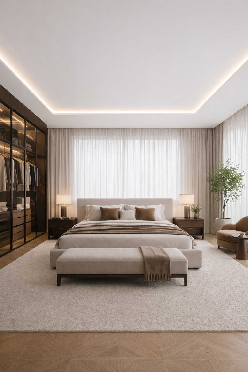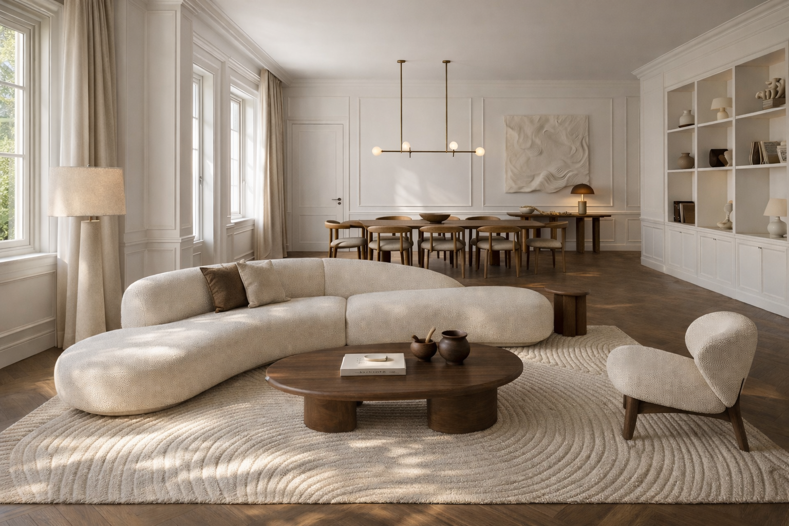 A warm, minimal space where light and materials quietly shape a continuous and sensory living experience.