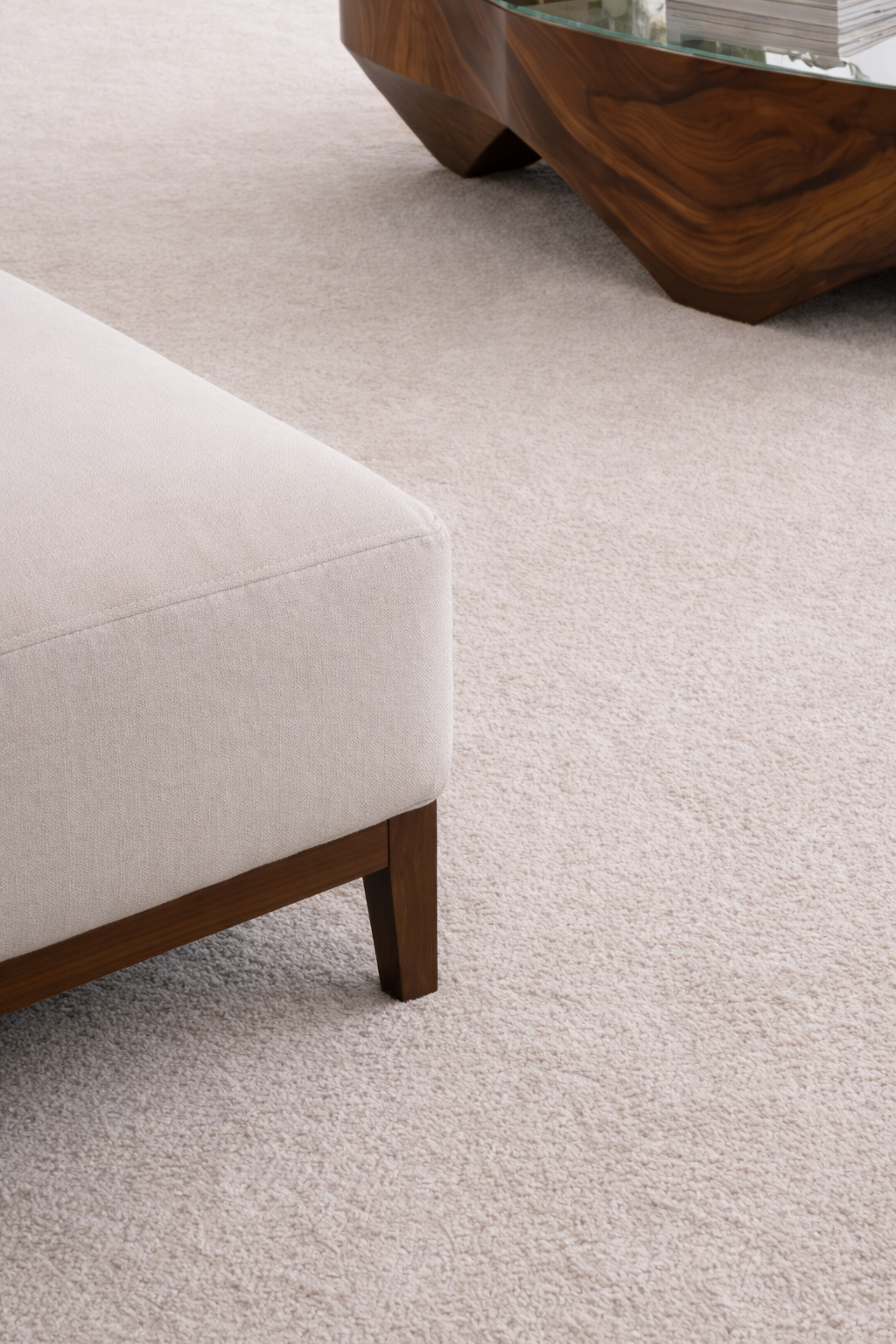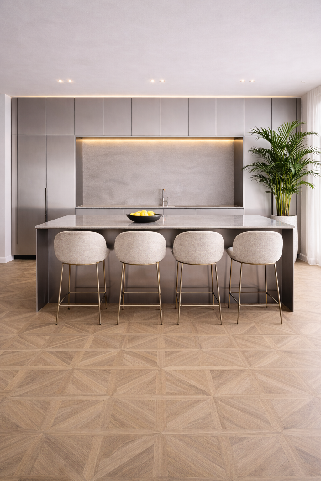 The atmosphere emerges from a delicate balance between softness and precision. Continuous mineral surfaces coexist with warmer, more tactile elements, creating a dialogue that feels both grounded and refined. The introduction of natural wood flooring plays a fundamental role in this equilibrium. Its warmth anchors the space, bringing a sense of familiarity and comfort that contrasts with the more technical, seamless finishes. The grain of the wood, its subtle variations, and its natural depth introduce a layer of quiet richness that cannot be replicated by more industrial materials.